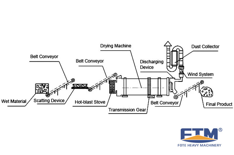 When a rotary dryer works, wet materials are firstly conveyed into the hopper by the belt conveyor. Then the feeder sends the materials into the higher feed end of the cylinder through the feed pipe. The materials falling down form a screen. The fan has begun work and the heat exchange starts. Under the effect of gravity, the materials move forward slowly with the rotating cylinder. In the rotating process, the plates inside lift up the scattered materials. Here, the materials in the air and on the cylinder will get heat from the scorching wind as well as the inner cylinder wall. In addition to the hot wind, heat carriers can be effluent gases and so on. After the heat carrier passes through the dryer, it is generally necessary for the cyclone to collect the material in the gas. If the dust content of tail gas needs to be further reduced, it should be discharged after passing through a bag filter or wet dust collector.